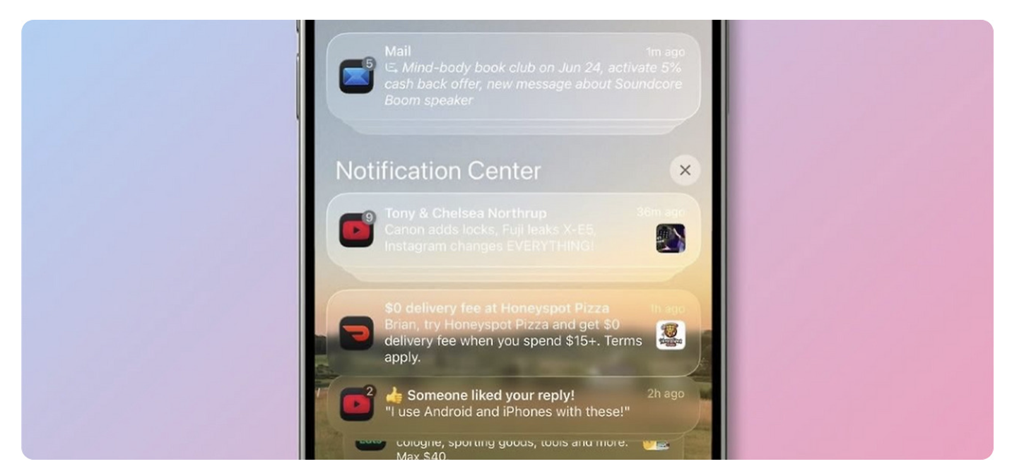 比如看郵件時,如果郵件內(nèi)容是純文字,玻璃背景會盡量 “隱身”,只保留淡淡的分層;如果郵件里有表格或圖片,背景會自動加強模糊,讓表格的邊框更清晰;就連收到推送時,通知欄的玻璃界面會比背景亮一點,既能提醒我 “有新消息”,又不會像扁平時代的彈窗那樣 “擋視線”。