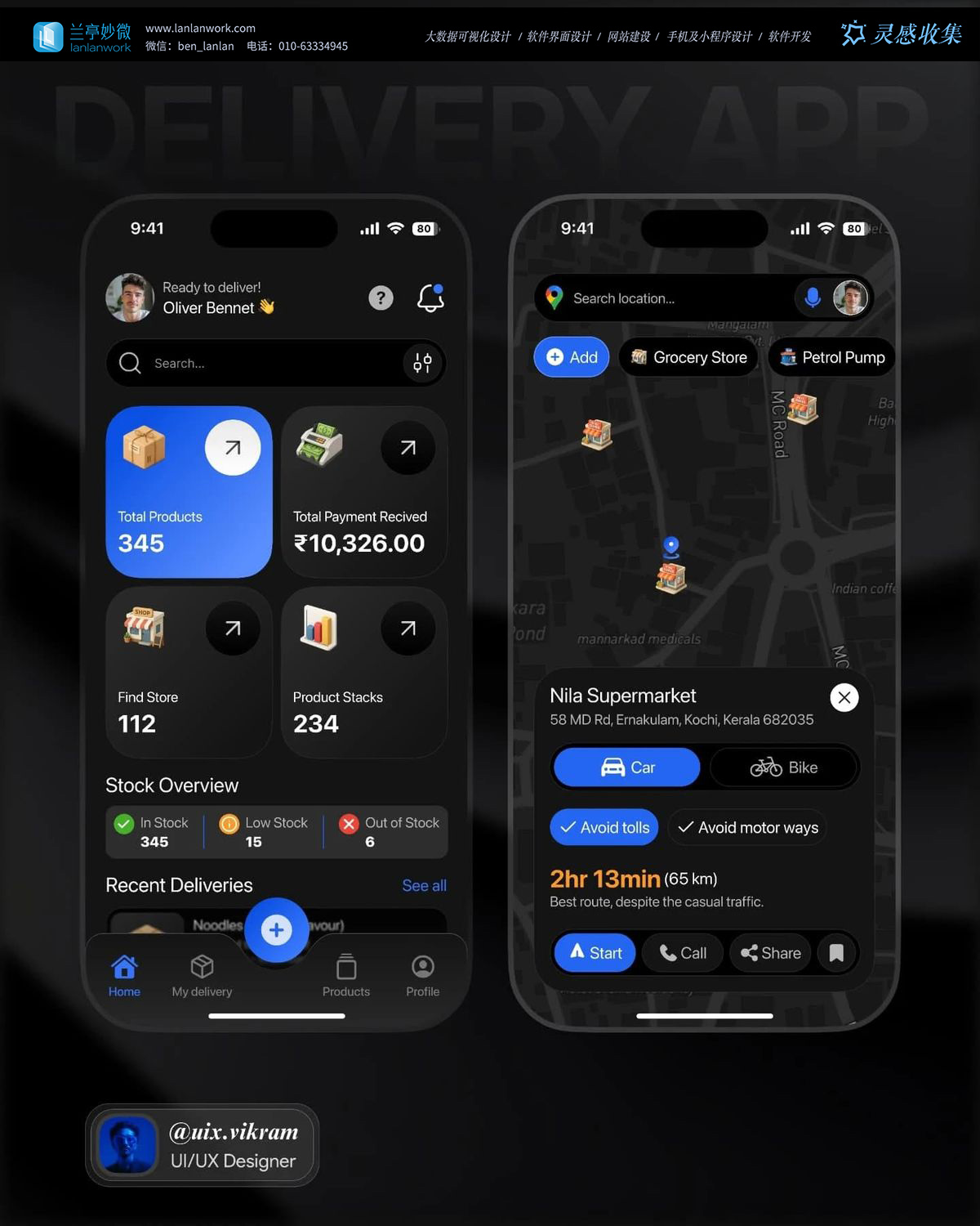 2. 一致性身份: 無論是預約App的青色、健康App的藍色還是配送App的紫色,都在深色畫布上保持了高度的品牌識別度。這確保了品牌形象在不同模式下的統一與延續。