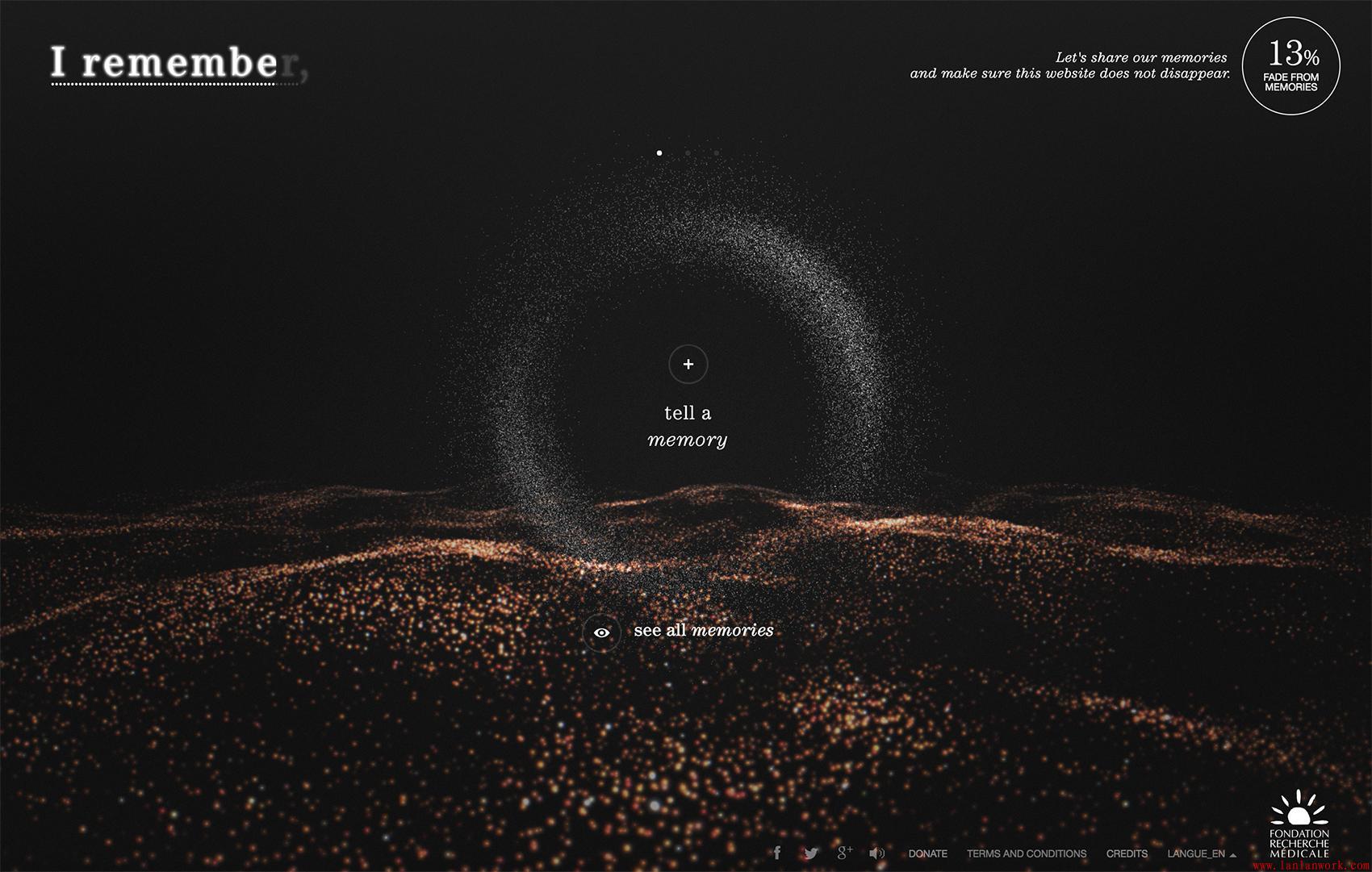 對于I Remember網(wǎng)站,主界面(動畫)立即引人注目,因為它邀請互動。雖然動作和界面是功能性導航工具,但視覺設(shè)計師利用這些元素的潛在損失作為傳達網(wǎng)站潛在使命的方式:阿爾茨海默病。就像組織為其籌集資金的患者的褪色記憶一樣,如果沒有積極的互動,網(wǎng)站就會慢慢消失。