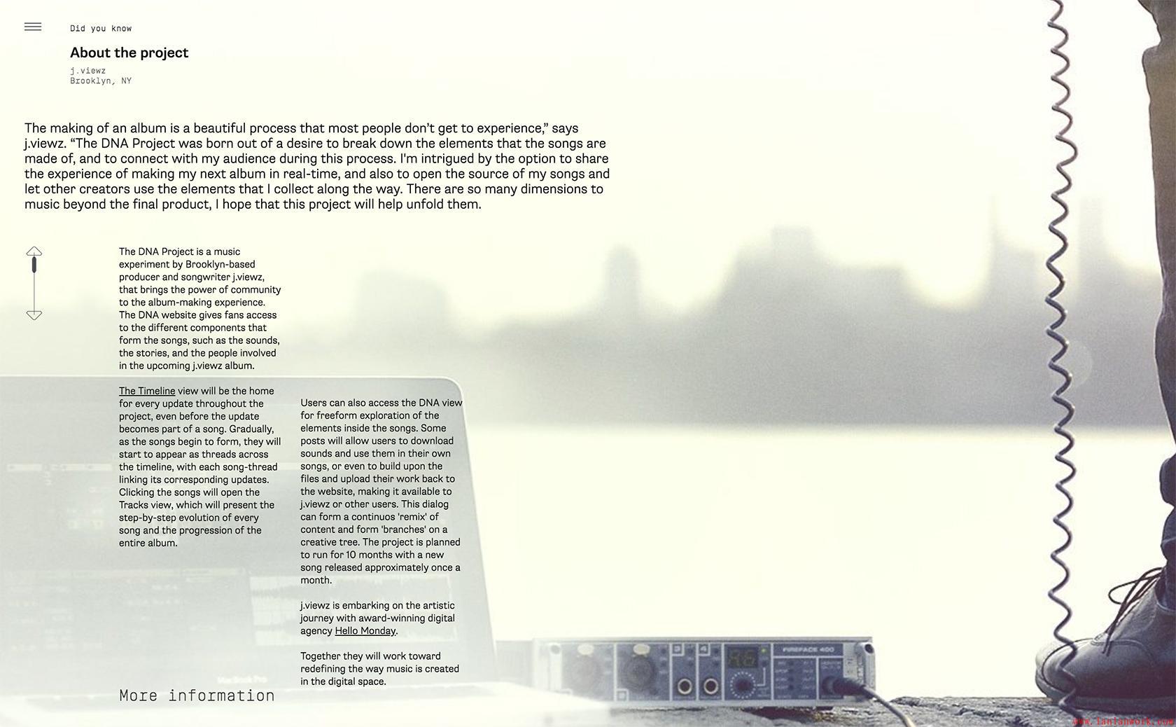 例如,DNA項目是一個使用一系列脫節(jié)層次結(jié)構(gòu)來傳達音樂家專輯創(chuàng)意結(jié)構(gòu)的網(wǎng)站。該網(wǎng)站的結(jié)構(gòu)很復雜,專輯的結(jié)構(gòu)也是如此。