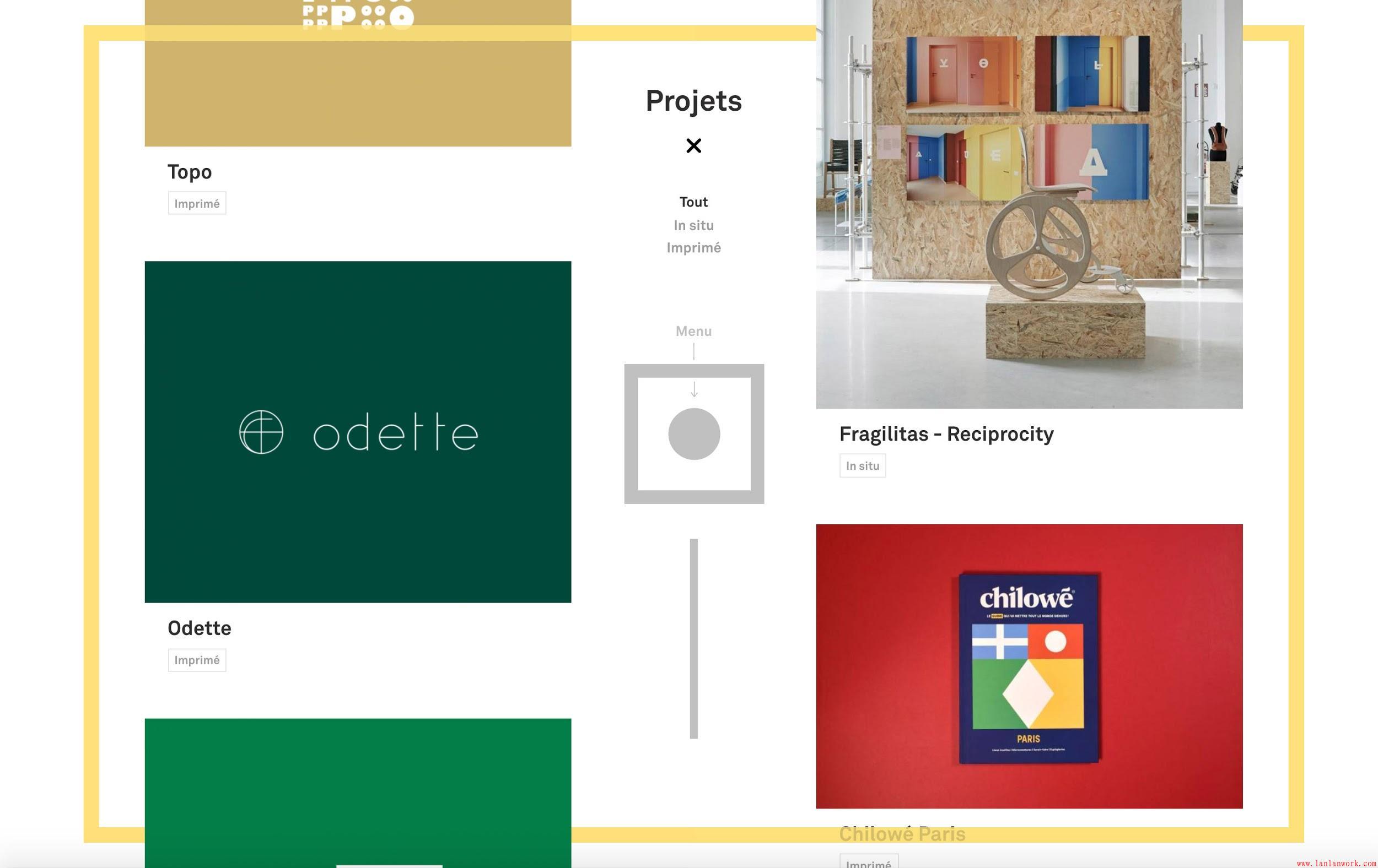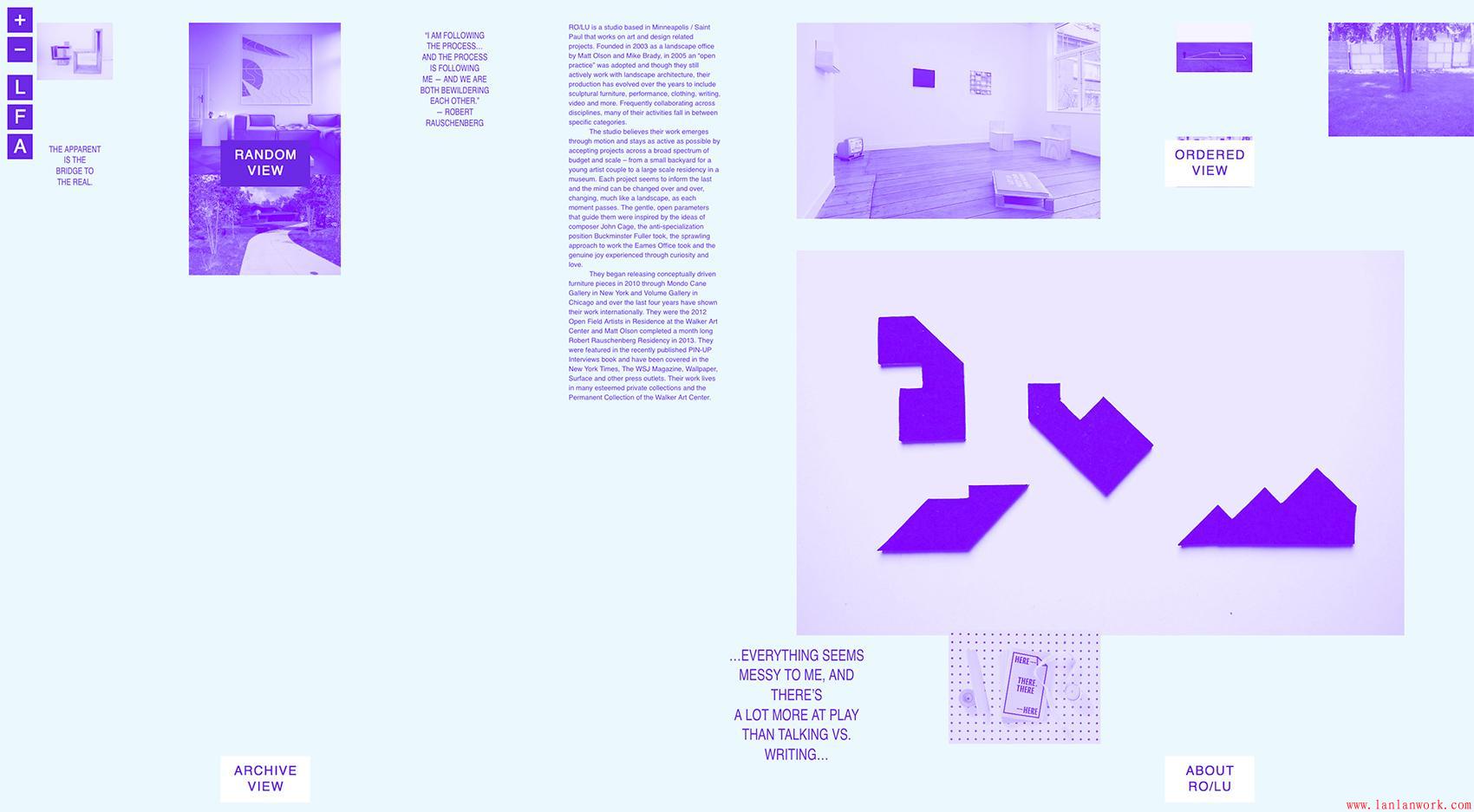 在大多數(shù)創(chuàng)意設(shè)計工作室的作品集中,作品沒有按層次組織,因為每個項目都是獨特的,并且被認為同樣重要Ro / Lu網(wǎng)站的設(shè)計創(chuàng)造了一個動態(tài)的構(gòu)圖,每次訪問都有不同程度的驚喜,并鼓勵觀眾調(diào)查工作室的廣泛組合。因此,設(shè)計工作室的折衷,跨學科性質(zhì)由內(nèi)容的隨機顯示。