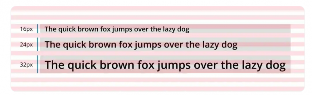 在上方的示例中,每8px行在紅色和白色之間交替。將文字的所有行高設(shè)置為基本單位(8x或4px)的倍數(shù),可以讓文本和基線網(wǎng)格完美對齊。